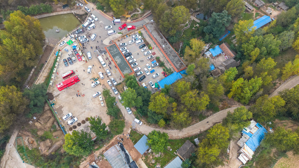 9月27日,在陇西县文峰镇桦林村,救援力量在当地党群服务中心广场集结(无人机照片)。新华社记者 郎兵兵 摄