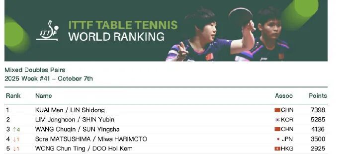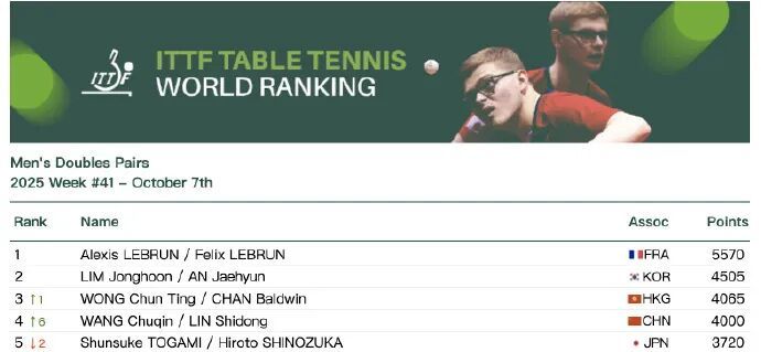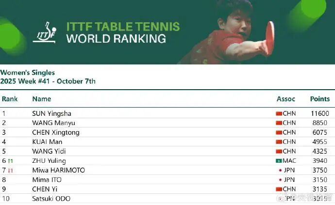 今天股E融,国际乒联公布2025年第41周世界排名。
